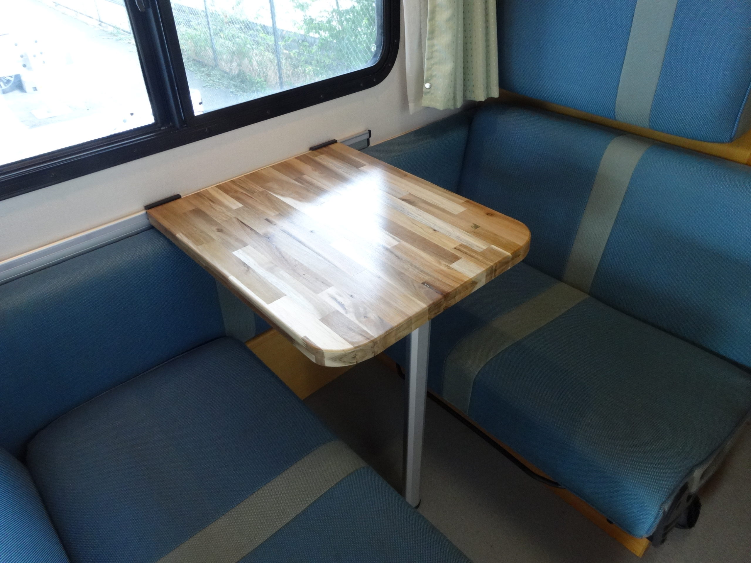 テーブルもアカシア集成材で製作。こういったキャンピングカー用のテーブル脚があります。