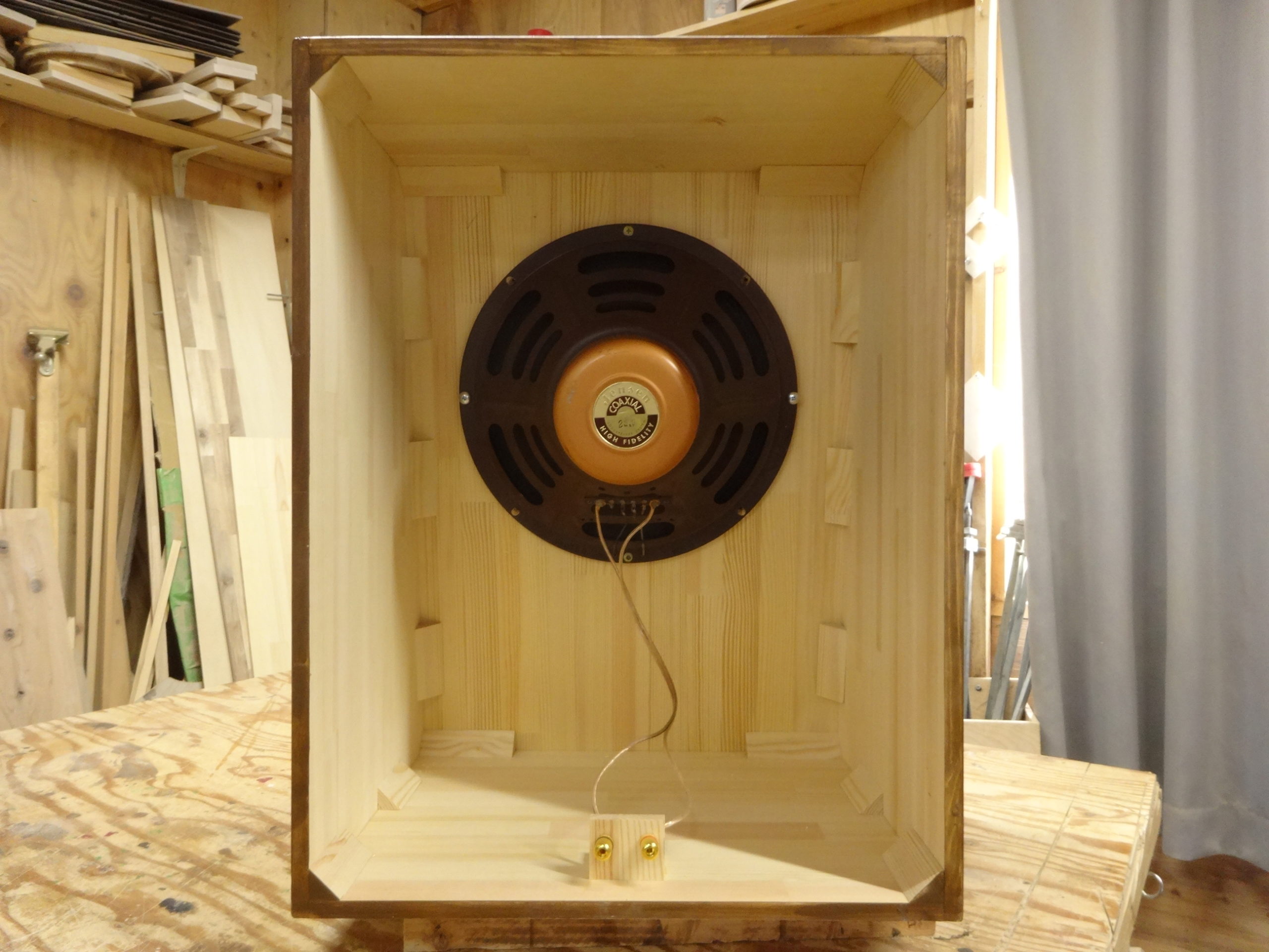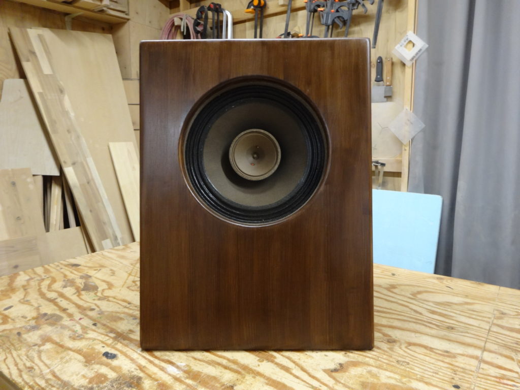 同軸の方は、赤松集成材t12mm、バッフル板のみt20mmを使用。OSMOウッドワックス・チークカラー仕上げ。