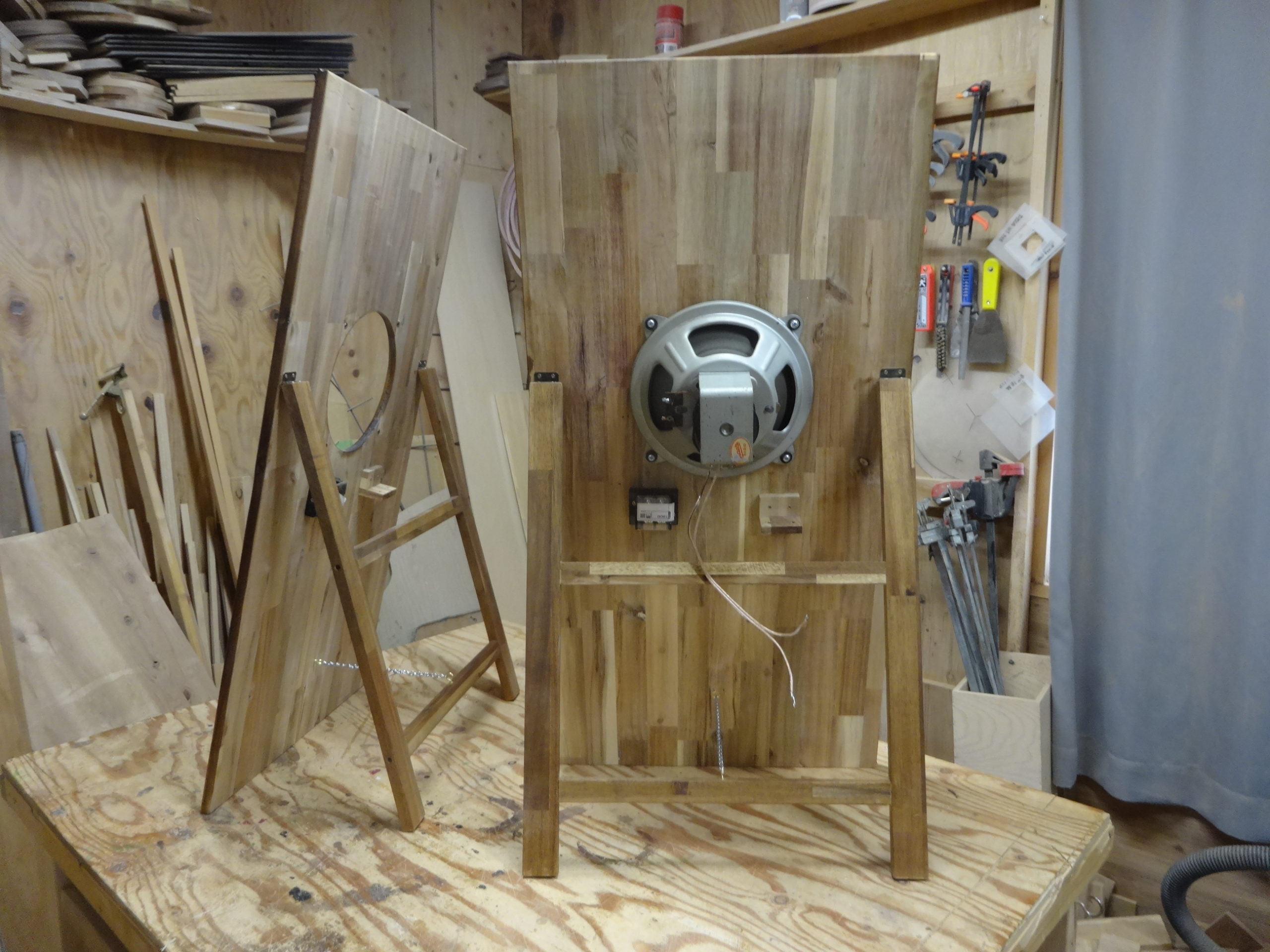 背面には、同材ではしご型のスタンドを作り、丁番を付けて自立出来る様にしました。
