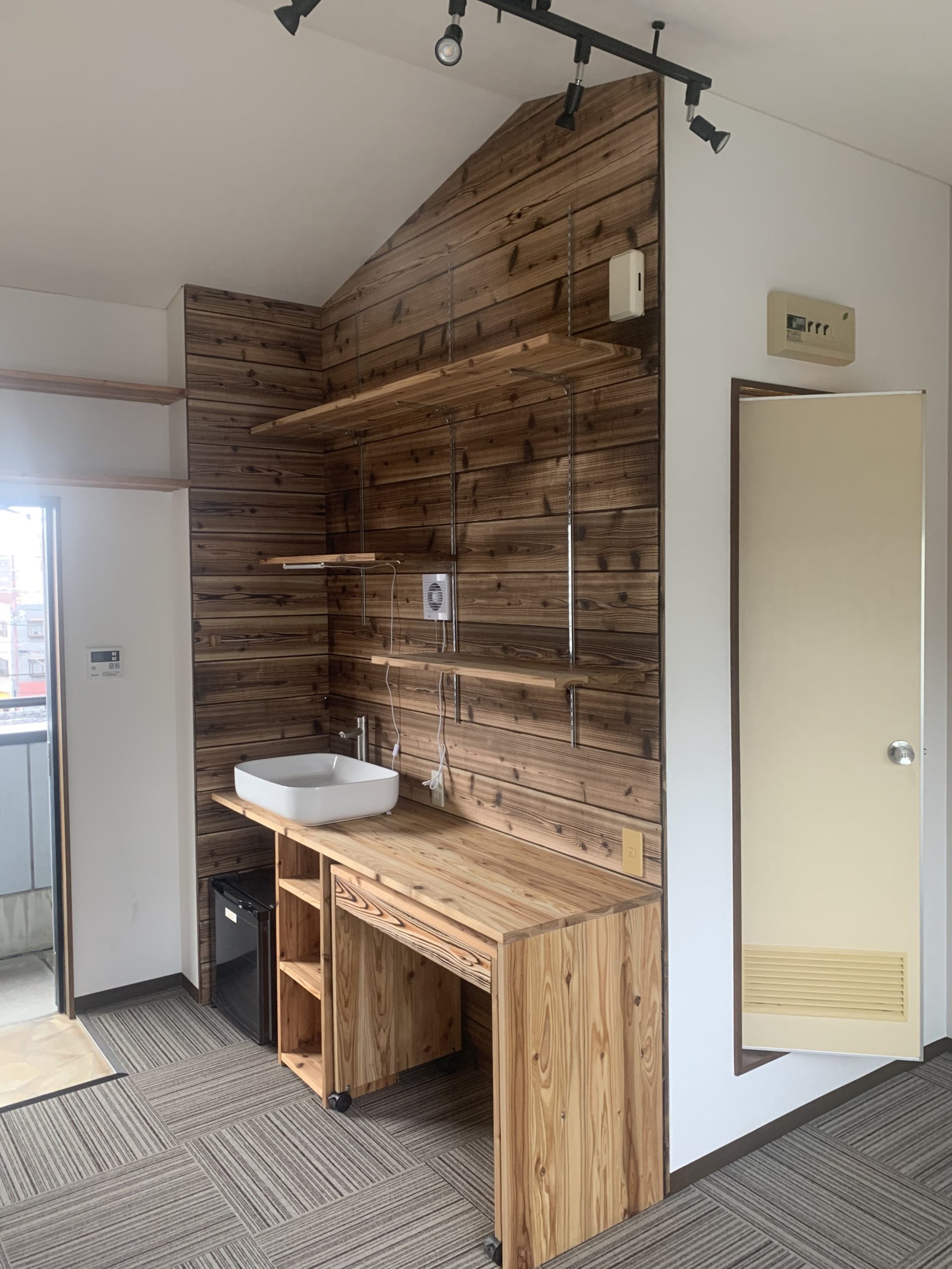 壁には、焼杉パネルを張り込み、スリット式のクロームメッキ・スチールの棚受けを取付。