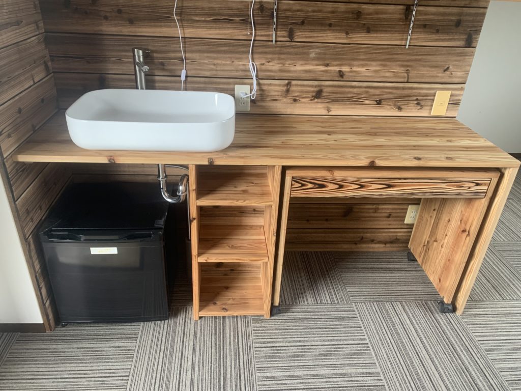 小型冷蔵庫を配置。横にはちょこっと置けるシェルフを。